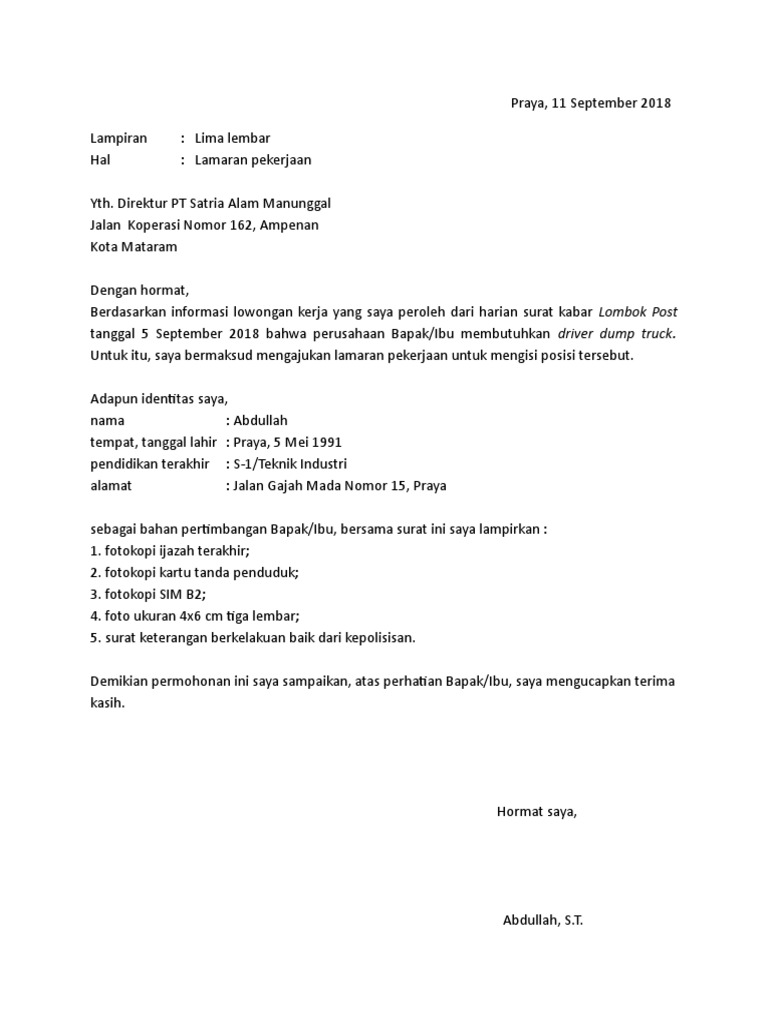 It's probably true that most of the words we write whether on social media or through email and text are input with our thumbs on our cell phones but there are lots of occasions in which we type messages. Pengalaman kerja dan skill 7. Surat lamaran kerja adalah surat yang digunakan untuk melakukan permohonan mendapatkan pekerjaan sesuai pengalaman pada perusahaan. Contoh cv surat lamaran kerja yang menarik ketika akan melamar pekerjaan disebuah perusahaan tentunya ada beberapa hal yang harus dipersiapkan, salah satunya adalah cv atau curriculum vitae. Kamu hanya perlu mengganti nama dan alamat pelamar, serta nama dan alamat perusahaan, kemudian menambah atau mengurangi kompetensi sesuai dengan yang kamu miliki. Kepala bagian personalia the blitz jl. Cotoh surat lamaran kerja drever tambang batubara. Libro de actividades geografia 6 to grado respueto. Inilah pembahasan lengkap terkait tulisan tangan contoh surat lamaran kerja driver 2019. 123 yogyakarta dengan hormat, bersama dengan surat lamaran pekerjaan yang telah saya buat ini, saya mengajukan diri agar bisa bergabung di perusahaan bapak / ibu pimpin. Begitulah informasi yang bisa kami uraikan mengenai contoh surat lamaran kerja di counter hp. Surat lamaran kerja sangat dibutuhkan oleh semua kalangan guna melamar pekerjaan baru baik untuk kamu yang baru lulus kuliah pindah kerja cari suasana baru maupun fresh graduate. 5 contoh surat lamaran kerja staff administrasi yang baik.